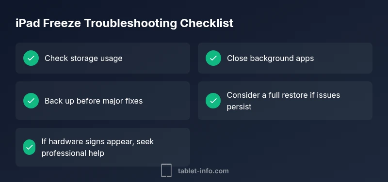 Ipad freezing is usually caused by software glitches, insufficient storage, or problematic apps. The quickest fix is to force restart, then update iPadOS and all apps, and free up storage by offloading or deleting unnecessary files. If issues persist, try closing background apps, resetting settings, or restoring from backup. Tablet Info notes similar causes and fixes in its troubleshooting guides.