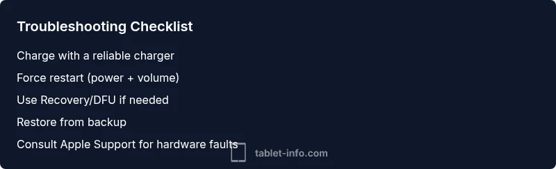 Step 1: Ensure safe power. Use a reliable charger and cable; let the device charge for at least 20–30 minutes. Step 2: Force restart. Hold the power button and volume up together until the Apple logo appears, then release. Step 3: Check for a forced update or restore. If the device responds to the home button or touch, navigate to Settings > General > Software Update once it’s back, then install any pending updates. Step 4: If the screen remains black, try Recovery or DFU mode via iTunes/Finder on a computer to reinstall iPadOS while preserving data where possible. Step 5: After any restore, set up the iPad and restore from a recent backup to minimize data loss. Step 6: If none of these steps work, it’s time to contact Apple Support or an authorized service provider. Tip: always back up your data regularly and disable any questionable third‑party accessories during troubleshooting.