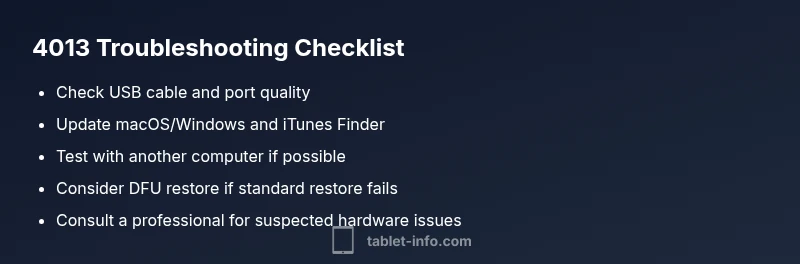 The phrase what is ipad error 4013 refers to a broad class of restoration and update failures that occur when the iPad and the computer (Mac or PC) cannot reliably communicate during a firmware flash. The error is usually displayed as: "The iPad could not be restored. An unknown error occurred (4013)." While the exact root cause can vary, the outcome is the same: the restore or update process aborts, potentially leaving data inaccessible or the device in recovery mode. According to Tablet Info, error 4013 is often tied to the first line of defense—the hardware and data path between the iPad and the computer. The Tablet Info team notes that many cases stem from simple, fixable issues before diving into more complex repairs. For iPad owners, recognizing this error as a signal to verify connections, not a fatal hardware fault, helps frame the next steps with urgency rather than panic.