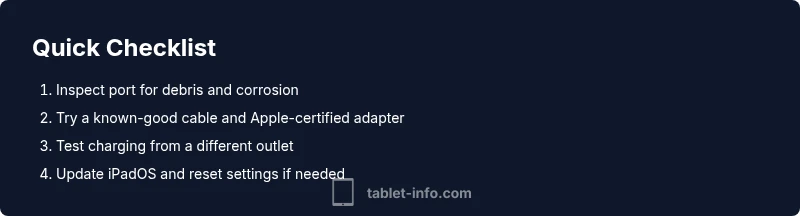 Begin with the simplest, safest checks. Power off the iPad and inspect the port under bright light. Look for lint, fuzz, or corrosion. Use a dry nylon brush or compressed air from a safe distance to dislodge debris—never insert metal objects. Test with a known-good, Apple‑certified cable and adapter. If available, try charging from a different power source to rule out outlet issues.