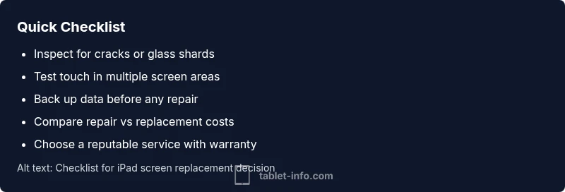 If you’re unsure whether to replace or repair, perform these quick checks to guide your decision: inspect the screen for visible damage, test touch responsiveness in several areas, and observe whether digital artifacts appear consistently across apps. Run a few basic iPadOS functions after a soft reset to see if issues persist. If you notice persistent artifacts, unresponsive regions, or crack growth, plan for professional evaluation. Tablet Info notes that a structured diagnostic approach saves time and money, especially when data loss or downtime would be costly.