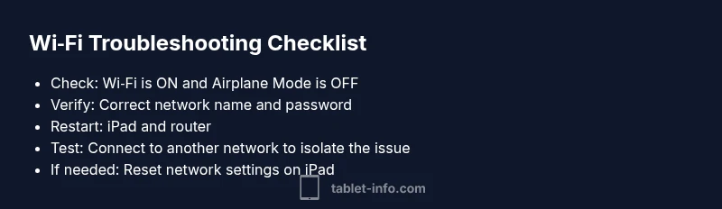 A stable Wi‑Fi connection on your iPad is essential for apps, streaming, cloud backups, and quick browsing. If you're trying to figure out why ipad won't connect to wifi, you’re not alone. The root cause is almost always a local network issue, misconfigured settings, or a temporary software glitch rather than a hardware fault. This guide from Tablet Info focuses on fast, practical steps that restore connectivity with minimal downtime. By starting with simple checks and advancing to targeted fixes, you can regain reliable access and keep your iPad running smoothly.
